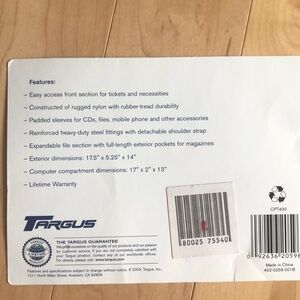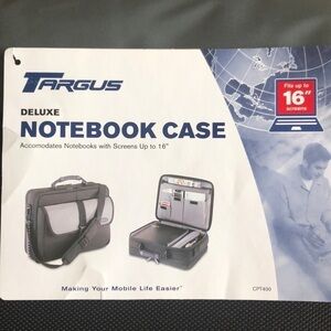 Messenger style Targus computer bag. Made of nylon with rubber tread. Adjustable shoulder strap. Tons of storage pockets in expandable file folder. See pics for dimensions. Fits up to a 16 inch screen laptop. This bag is new with tag removed. Colors are gray and black. From smoke free and pet free home. Perfect for work and makes travel easy. Quality brand.
