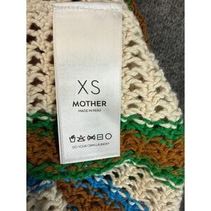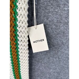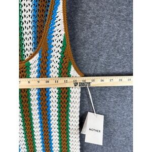 The Benefits Dress by MOTHER is a vibrant, open-knit crochet midi dress featuring a vertical striped pattern in white, brown, green, and blue. Crafted in Peru from 100% cotton, this sleeveless piece offers a relaxed, bohemian aesthetic with a deep scoop neckline and a playful long-fringe hem. The breathable knit construction makes it an ideal choice for beach outings, festivals, or layered summer styling.