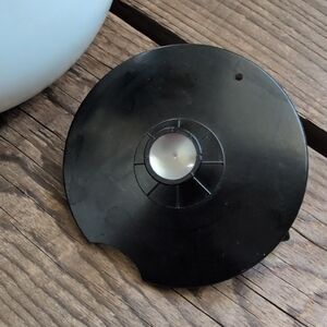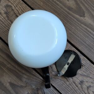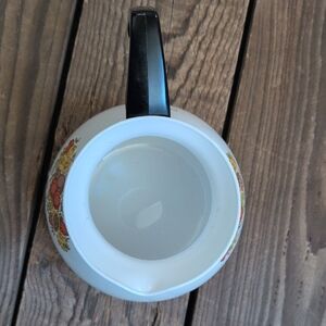 Classic retro Corningware ceramic tea or coffee pot with colorful floral decal. Black handle and lid.