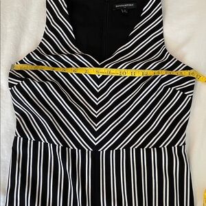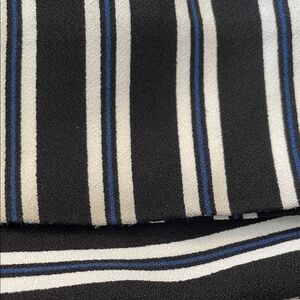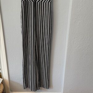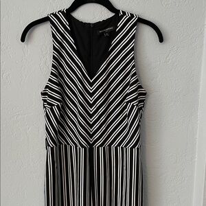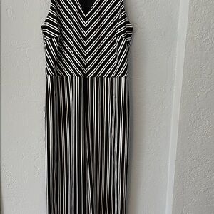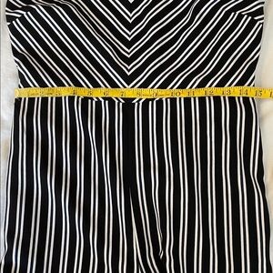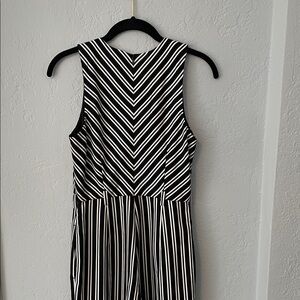 Banana Republic Sleeveless jumpsuit with a V-neckline and bold black-and-white stripe pattern. Vertical and chevron stripes create a flattering silhouette. Has belt loops. The garment tag has been removed. Polyester blend. Wash cold gentle cycle. Tumble dry low. There is a slight discoloration at the hem. See last photo. Otherwise in great used condition no rips stains snags or pilling. Stored and shipped from a smoke free home. Reasonable offers welcomed or bundle with another item for a 20% discount and savings on shipping costs.