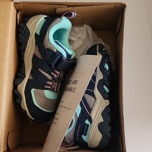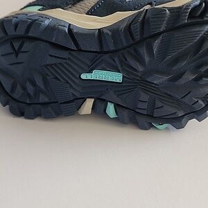 Kids trail sneakers by Merrell. Lace-and-strap closure for secure fit. Rugged outsole for traction. Breathable upper with supportive overlays. Versatile for outdoor play and hikes.