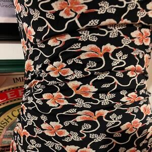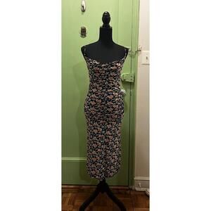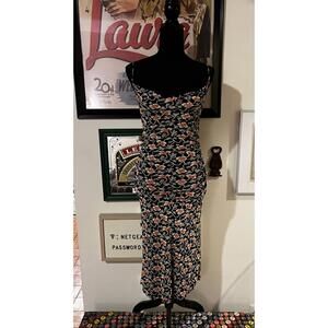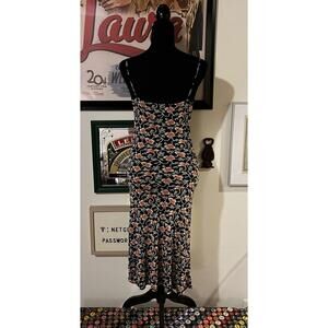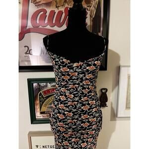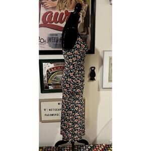 Stretchy black slip dress with a floral print from Free People. Cowl neckline with slight ruching around the waist. Vintage, pre-2000. Women's size small, in excellent condition.