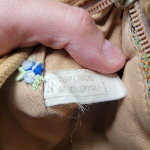 The product is a Vintage 1970's Carpet Bags Of America Gold Velvet Shoulder Purse with ribbon. This original gold velvet purse is a classic statement accessory, perfect for casual occasions. The 1970s design and unique ribbon detail add a touch of nostalgia and elegance to the overall look. Made by Carpet Bags Of America, this purse is a one-of-a-kind piece that will surely make a fashion statement.