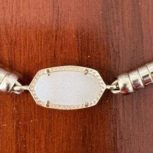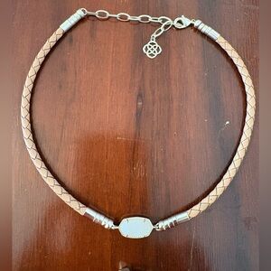 Tan braided Kendra Scott necklace and bracelet with white Drusey stone. Features silver accents with adjustable necklace clasp and bracelet chains. A white sparkling Drusey is the central stone on both. Gently loved, no flaws.Perfect for any occasion. Original duster included.