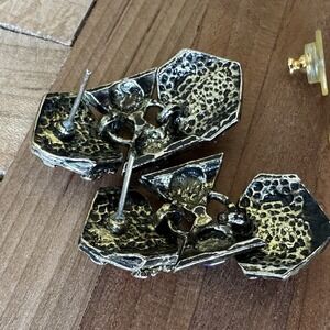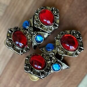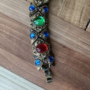 This Vintage Byzantine Etruscan Mogul Cabs Bracelet size 7 inch with matching Earrings 1.5 inch is a vintage jewelry set featuring a multicolor design with ornate details. Handmade in the United States, this fashion accessory is perfect for various occasions such as Mother's Day, Christmas, weddings, anniversaries, birthdays, and Valentine's Day. Made of metal and acrylic materials, this unique set captures themes of beauty, art, and fantasy, making it a stunning addition to any jewelry collection. The gold tone metal base and intricate design of this bracelet and earrings set make it a standout piece for those who appreciate vintage and artisan crafted pieces. This bracelet and earring set is in good pre owned clean condition with some minor use wear, all original acrylic multicolor jelly belly style cabochons bezel set into antiqued gold tone metal alloy, the closures function properly and are in good shape. Please review the pictures for more details and size measurement info thank you.
