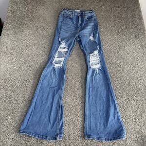 Style: Womens juniors high rise flared jeans with heavy front distressed detailing.