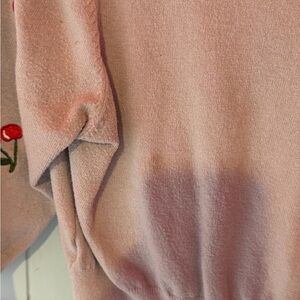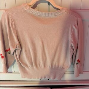 Soft pink V-neck cardigan with playful red cherry embroidery. Lightweight knit with button-front closure for easy layering. Feminine cropped silhouette and three-quarter sleeves for a flattering fit. Perfect for casual and dressy looks.