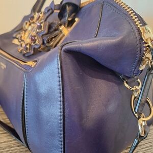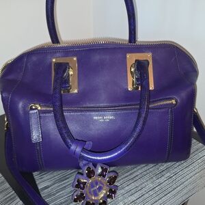 Satchel in color eggplant. Features gold-tone accents and very spacious interior. Perfect for any night out, travel. Fits all essentials. Structured handles & detachable strap. Studded framed bottom. Exterior zip pocket, interior zip pocket and 3 extra pockets.
