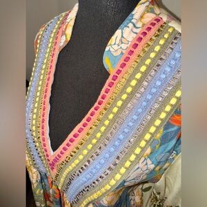 Beautiful Bl-nk London x Anthropologie “Stephanie” blouse featuring a vibrant mixed floral print and signature embroidered V-neck detail. This boho-inspired top blends soft, lightweight fabric with intricate trim work for an effortlessly feminine look.