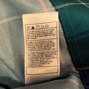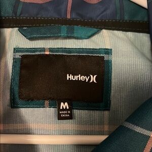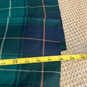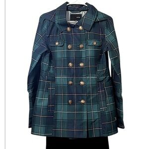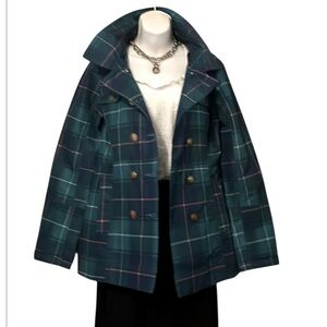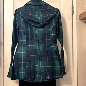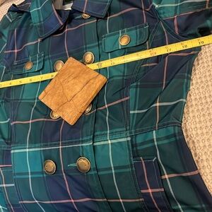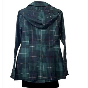 Hurley hooded, blue green, pink plaid unlined double breasted lightweight trench pea coat raincoat with antique gold tone buttons