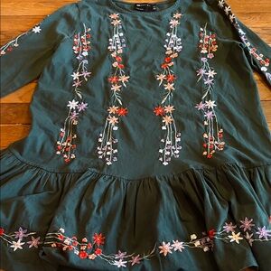 Dark green long sleeve top with vertical floral embroidery. Multicolored embroidered flowers in red, pink, purple, cream, and white. Round neckline and a relaxed fit. Pretty boho-inspired detail.