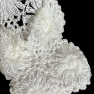 Beautiful soft white crochet shawl with intricate floral patterns. Perfect for adding elegance to any outfit. Made in Japan. Not perfect but no major flaws.