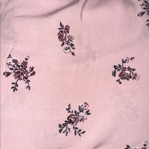 Soft pink off-shoulder top with small dark floral motifs. Elasticized neckline and short flutter sleeves. Lightweight, breezy fabric for warm days. Easy to style with casual bottoms.