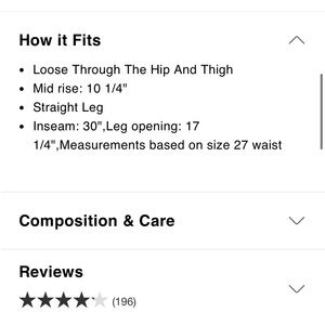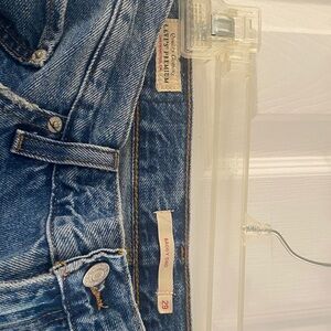 Relaxed baggy dad style with a wide leg and like fit. Medium blue denim with subtle faded details. Classic five-pocket styling and belt loops. Easy to style for everyday wear. 28 inch inseam for length. Small bleach stain at bottom leg of right pant as shown in pictures. No other wear noted.