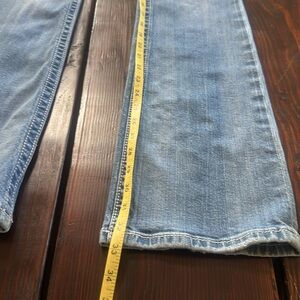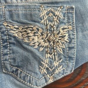 Stylish boot cut jeans with intricate silver embroidery on back pockets. Perfect for casual outings. Classic denim look