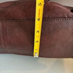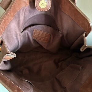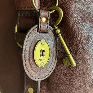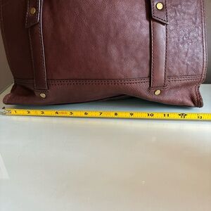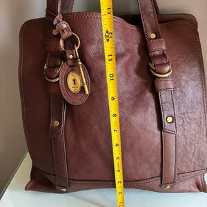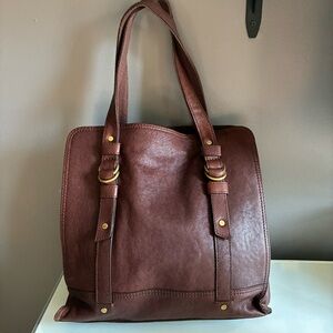 Classic brown leather tote for everyday use. Features durable straps and brass hardware for a polished look. Multiple pockets for easy organization. Soft leather construction provides comfortable carry. Brown color complements many outfits.