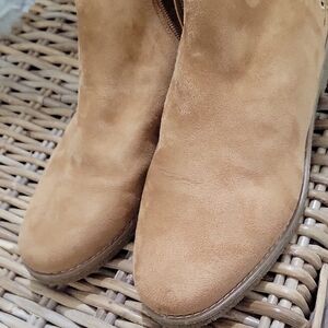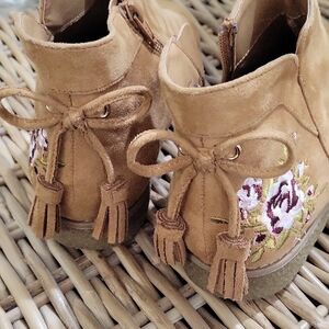 Tan suede-look ankle booties with floral embroidery at the heel. Side zipper for easy on and off. Tassel accents add playful detail. Lightweight sole for everyday comfort.