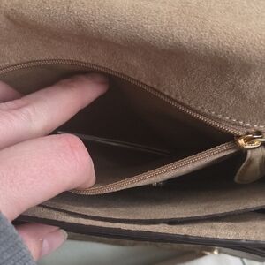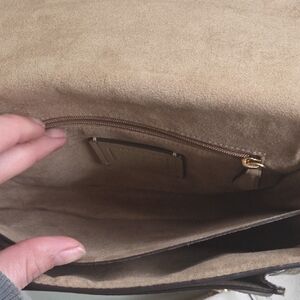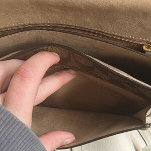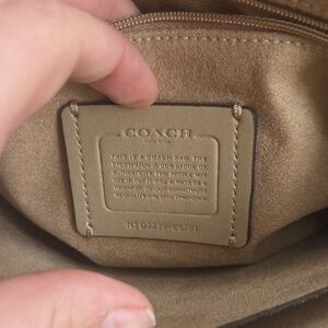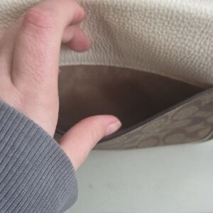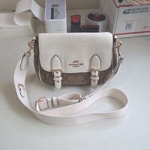 Chic Coach crossbody bag with cream leather and brown accents. Features adjustable strap and signature logo.