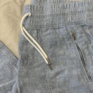 Gently used Athleta Cabo Linen pants. Comfortable and stylish joggers. Features elastic waistband and zip pocket. Ideal for casual wear or a day on the beach. Size 6. No stains, rips, or pilling visible.