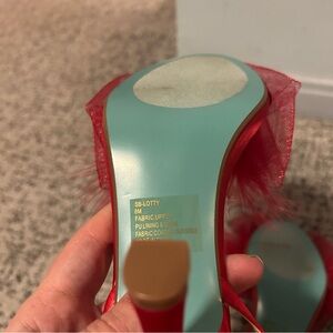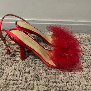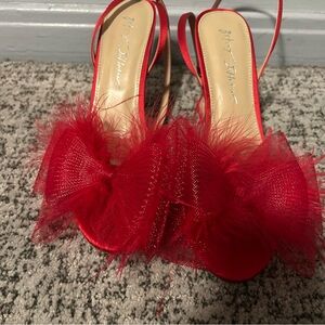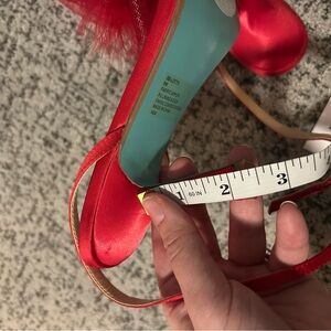 Betsey Johnson Red Bow Feather Sb-lylla Strappy Heeled Sandals. Minimal signs of wear on the bottoms. As shown in photos above. In otherwise great preowned condition. Feel free to make a reasonable offer through the offer button!