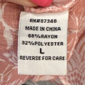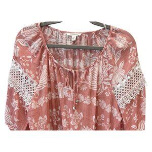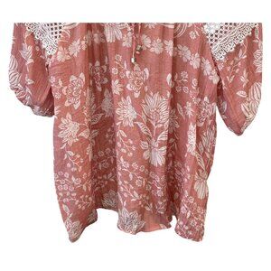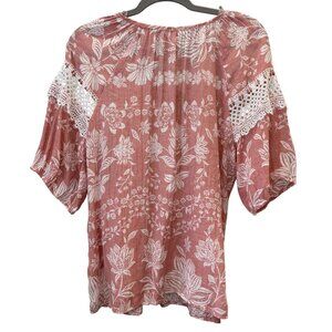 Palm Rio Womens Floral Peasant Blouse L Pink White Lace 3/4 Sleeves Flowy