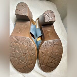 Beautiful Born Hand Crafted Footwear blue leather slingback heels in size 10M. These sandals feature a soft blue leather upper, open peep toe front, cutout side detail, cushioned tan footbed, and a sturdy stacked-style brown block heel/platform sole for that signature Born comfort-meets-style look.