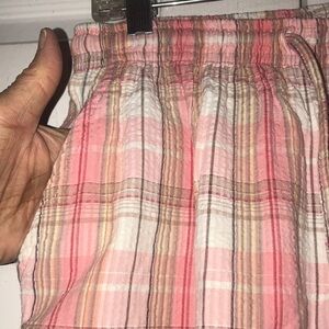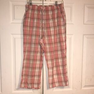 Women’s seersucker capris feature a plaid pattern in red, salmon pink, tan & black. Front slant pockets. Elasticized waistband with pull cords in the front. 100% cotton. In excellent condition & look cool & airy for casual summer weather. Sz L.