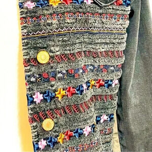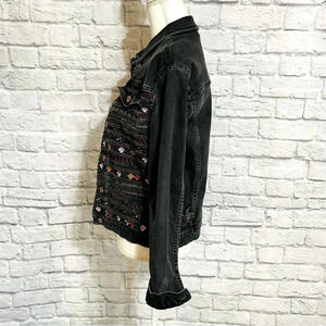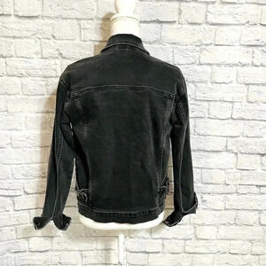 Adorable Topshop jean jacket with embroidered detail. Black washed out denim. Used condition, there are various threads hanging from the raw edge details.