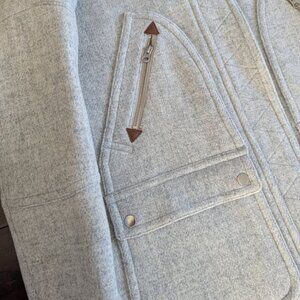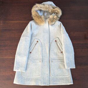 New with tags J. Crew Heather Dusk Chateau Parka Italian Stadium Cloth by Nello Gori in women's size 2. Made from a grey wool blend with detachable brown faux fur trim.