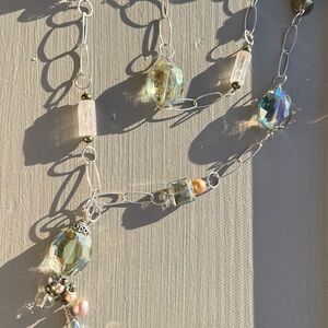 This necklace features faceted crystals and elegant pearls, perfect for any outfit. The silver chain complements the sparkling stones beautifully.