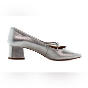 These stunning Vince Camuto Charley pumps offer a modern twist on the classic Mary Jane. Crafted from premium metallic nappa leather with a gleaming silver finish, they feature a chic square toe and a ballet-inspired gored bow tie-up detail. The manageable block heel makes them perfect for both special occasions and elevated everyday wear.