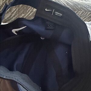 Nike cap in dark blue with a white embroidered Swoosh. Six-panel design with stitched eyelets. Curved brim for sun protection. Clean, sporty look for everyday wear.