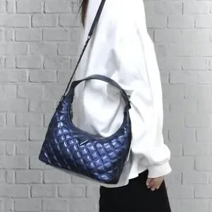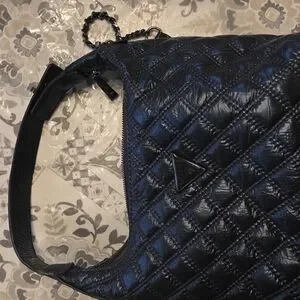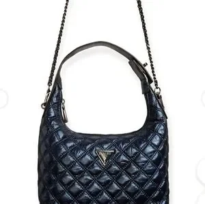 New with tags! This authentic GUESS Cessily hobo, originally from Macy's, features a stunning quilted metallic finish in Midnight Blue. This versatile "two-in-one" design includes a dual turn-lock shoulder strap and a detachable crossbody strap, allowing you to switch styles instantly. Rare, discontinued color and brand-new condition make this a must-have for any collector.