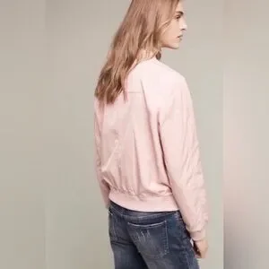 Anthropologie HEI HEl Journey Bomber Satin Jacket Blush Pink Women's Size Small in very nice used condition. This lightweight jacket is so cute and perfect for the spring transition. It is a dusty rose, blush pink color, the Anthro photos make it seem more light pink. It has a rose gold tone zipper front with side pockets and ribbed collar, cuffs and hem. Measurements lying flat are approximately 20” inches underarm to underarm and from shoulder to hem approximately 22” inches. Super cute 🤍
