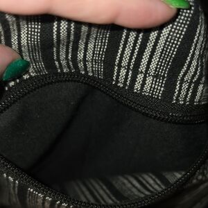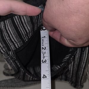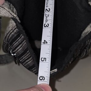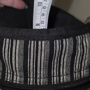 Hi there. Measurements, please? And is there a zipper on top, or inside, or both? (I can't tell if some of the photos are with the purse inside out, or what! One photo of the striped side seems to have a zipper, but the other doesn't.) Thanks