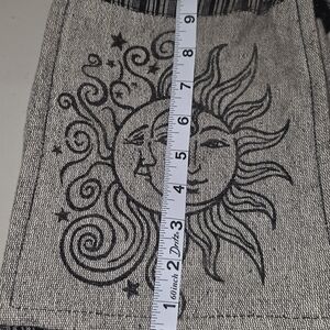 Stylish boho crossbody with sun and moon artwork. Lightweight gray fabric with adjustable strap for comfortable wear. Casual design perfect for daily errands and festivals. Features a secure flap closure and artistic printed detail. A versatile gray accessory to complement relaxed outfits.