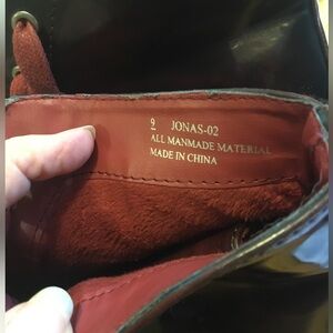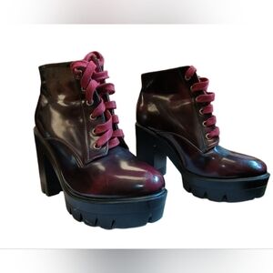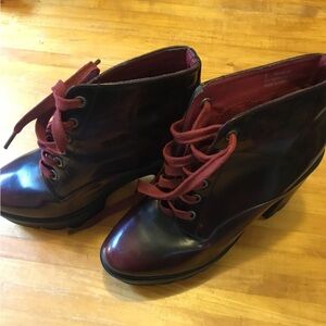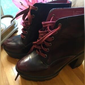 Bamboo, Very dark red / black red Chunky ankle boots. Comes with red strings, could be changed out for black or your preference. Size is 9/39, I am a true 9 and they fit perfectly. Please note the scuff on the inside of the right boot along with the wear at the top of the right boot. See pictures