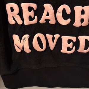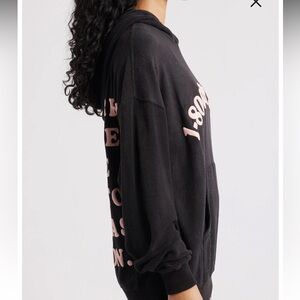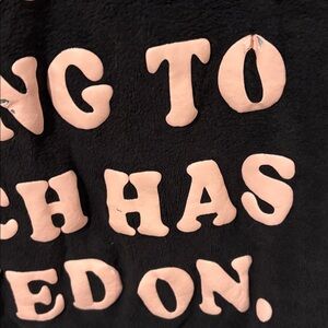 Soft black pullover hoodie with bold pink arched text on front. Kangaroo pocket and hood. Casual graphic style. Easy to layer.