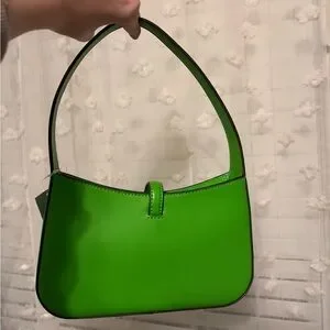 Michael Kors shoulder bag in bright lime green zebra pattern. Silver MK medallion and hanging key charm. Smooth green leather trim with single shoulder strap. Fashion-forward piece with bold animal print.