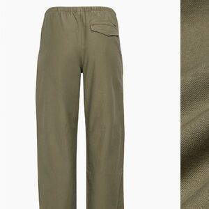 Aritzia track pants in olive green. Drawstring elastic waist for comfort. Wide-leg relaxed fit. Side pockets for convenience. Casual everyday style.