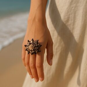 This stunning ring features a unique shell design, perfect for adding a touch of elegance to any outfit. The intricate details and natural colors make it a standout piece. 100% natural conch shell ring! Sure to standout and keep the compliments coming! Everyone will ask- “where did you get that fabulous ring!?”
