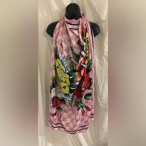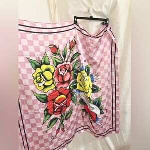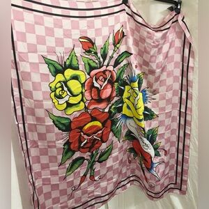 Ed Hardy pink white checkerboard pattern red roses iconic Ed Hardy red yellow florals rose print satin effect oversized shawl scarf brand new