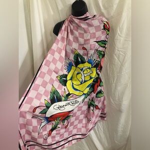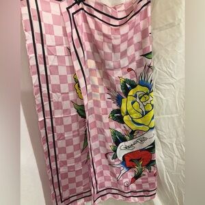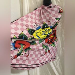 Ed Hardy pink white checkered iconic Ed Hardy red rose florals scarf shawl new