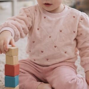 Soft blush pink pullover sweatshirt with an allover tiny heart print, plush terry texture, and sweet puff sleeves. Cozy crewneck style with ribbed trim at the neckline, cuffs, and hem. Cute for Valentine’s Day, playdates, photos, or everyday cozy outfits.