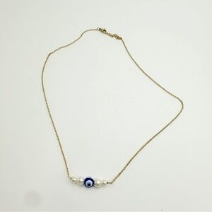 Gold Tone Chain Necklace with Evil Eye and Faux Pearl Beads