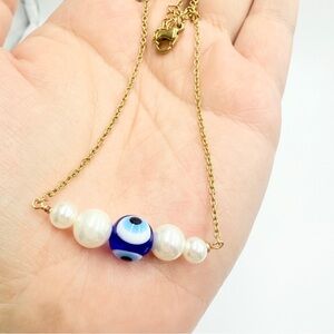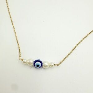 This elegant necklace features a delicate gold tone chain adorned with three lustrous white faux pearl beads and a striking blue evil eye bead at the center. The minimalist design makes it perfect for everyday wear or as a meaningful gift symbolizing protection and good fortune. Lightweight and comfortable, this piece adds a touch of charm and positive energy to any outfit.
