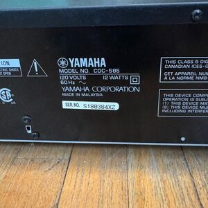 Brand: Yamaha Model: CDC-585 Type: 5-Disc Carousel CD Changer Color: Black Features: Natural Sound, PlayXchange, CD Text Disc Capacity: 5 Audio Outputs: Digital Optical, Stereo L/R RCA Playable Media: CD, CD-R, CD-RW Display: Amber LED Dimensions: Approx. 17" x 15" x 4.5" Weight: Approx. 13 lbs Year: Circa 2002-2005 Condition Note: Unit shows some cosmetic wear, including residue/scuffing on the top right corner. Product is in very good physical condition, some general signs of wear however in overall good condition. Has been tested and functional, disc tray spins and works flawlessly, only thing I haven't tested is sound as I don't have speakers. Conditon is excellent aside from the one mark up top. Side Note: I do own pets so please be mindful there may be hairs present, I will do my best to remove any blemishes/debris that I find in any of my merchandise. Please let me know if you have any questions or concerns. Thank you