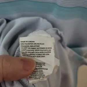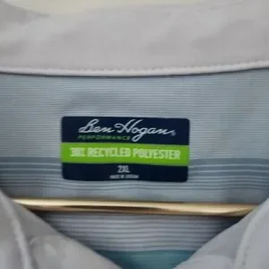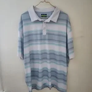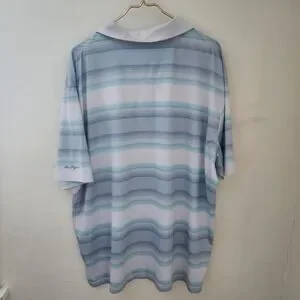 Ben Hogan Performance polo shirt in size 2XL. This short-sleeve collared shirt features a classic button placket and a refreshing blue, white, and light aqua horizontal stripe pattern. The fabric blend incorporates recycled polyester for a comfortable and sustainable feel. Perfect for a day on the golf course or a casual outing.
