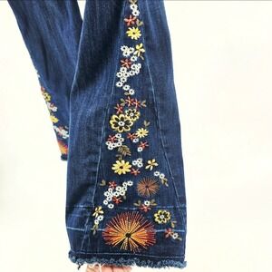 Stylish dark wash flare jeans featuring detailed floral embroidery along the legs for a unique, eye-catching look. Designed with a flattering fit and comfortable stretch, finished with a trendy raw hem.
