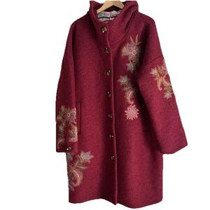 Sundance Blooming Bouclé Embroidered Wool Blend Hooded Coat Size XL Red